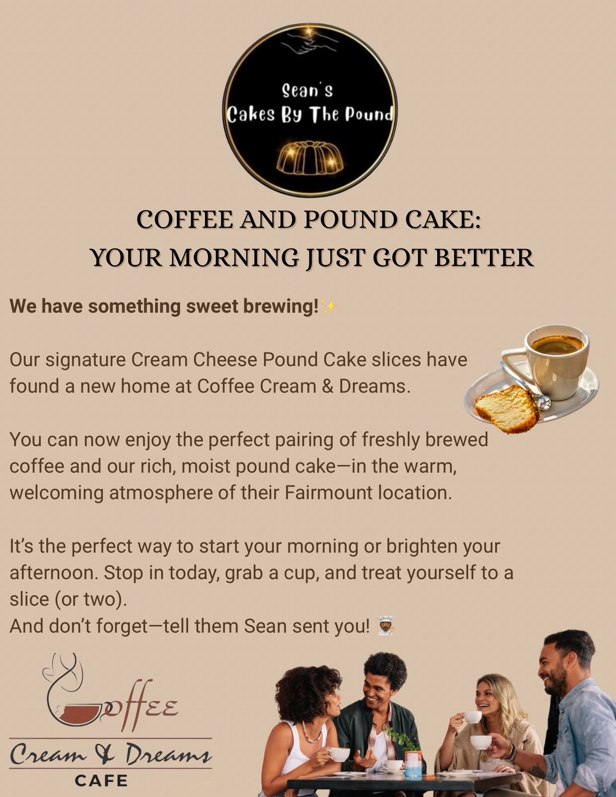 At Sean's Cakes By The Pound, each bite is a celebration of heritage and flavor. Rooted in generations of family tradition, we offer the rich, authentic taste of our homemade cream cheese pound cakes and desserts, crafted with love and a touch of innovation. Indulge in the comfort of time-honored recipes, while savoring fresh, creative twists that honor our legacy and delight your senses.